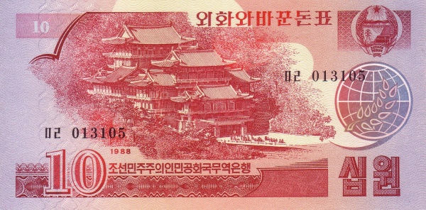 Coreea de Nord 18 4.10 NECIRCULATA 1 Won 1978 Coreea de Nord 22 7.15 NECIRCULATA 100 Won 1978 Coreea de Nord 23 1.65 NECIRCULATA 1 chon 1988 (vizitatori capitalisti) Coreea de Nord 25 1.65 NECIRCULATA 10 chon 1988 (vizitatori capitalisti) Coreea de Nord 26 1.65 NECIRCULATA 50 chon 1988 (vizitatori capitalisti) Coreea de Nord 31 4.55 NECIRCULATA 1 chon 1988 (vizitatori socialisti) Coreea de Nord 32 1.65 NECIRCULATA 5 chon 1988 (vizitatori socialisti) Coreea de Nord 33 1.95 NECIRCULATA 10 chon 1988 (vizitatori socialisti) Coreea de Nord 37 9.35 NECIRCULATA 10 Won 1988 (vizitatori socialisti) Coreea de Nord 40 3.30 NECIRCULATA 5 Won 1998 Coreea de Nord 43 6.65 NECIRCULATA 100 Won 1992 Coreea de Nord 44 4.90 NECIRCULATA 500 Won 1998-2007 Coreea de Nord 45 6.65 NECIRCULATA 1000 Won 2002-2006 *nou* Coreea de Nord 46 2.55 NECIRCULATA 5000 Won 2002-2006 Coreea de Nord 48 4.10 NECIRCULATA 200 Won 2005 Coreea de Nord 49 9.80 NECIRCULATA 1 Won 1992 (comemorativa: 95 de ani de la nasterea lui Kim Ir-Sen; tiparita in 2007) Coreea de Nord 59 7.80 NECIRCULATA 10 Won 2002 Coreea de Nord 60 5.45 NECIRCULATA 50 Won 2002 Coreea de Nord 62 8.95 NECIRCULATA 200 Won 2008