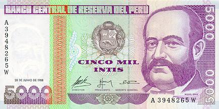 Peru 112 6.65 NECIRCULATA 10 Soles Oro 1976 (fara PAGARA AL PORTADOR) Peru 117 8.95 NECIRCULATA 5000 Soles Oro 1985 Peru 128 4.10 NECIRCULATA 10 Inti 1985-1986 (tipograf: De la Rue; versiunea mai rara) Peru 129 3.30 NECIRCULATA 10 Inti 1987 (tipograf: IPZS Roma; versiunea comuna) Peru 131 2.90 NECIRCULATA 50 Inti 1987 (tipograf: Cd M-B; versiunea comuna) Peru 133 3.30 NECIRCULATA 100 Inti 1987 (tipograf: Bundesdruckerei; versiunea comuna) Peru 134 3.30 NECIRCULATA 500 Inti 1987 Peru 136 4.10 NECIRCULATA 1000 Inti 1988 Peru 137 5.45 NECIRCULATA 5000 Inti 1988 (tipograf: Giesecke & Devrient; versiunea comuna)