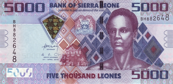 Sierra Leone 30 4.55 NECIRCULATA 1000 Leones 2010-2021 (dimensiuni reduse) Sierra Leone 31 5.45 NECIRCULATA 2000 Leones 2010-2021 (dimensiuni reduse) Sierra Leone 32 9.80 NECIRCULATA 5000 Leones 2010-2021 Sierra Leone 34 2.90 NECIRCULATA 1 Leone 2022 Sierra Leone 35 3.75 NECIRCULATA 2 Leones 2022 Sierra Leone 36 4.90 NECIRCULATA 5 Leones 2022