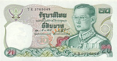 Thailanda 88 8.95 NECIRCULATA 20 Baht (nedatata) Thailanda 98 8.95 NECIRCULATA 10 Baht 1995 (comemorativa: 120 de ani Ministerul de Finante) Thailanda 109 7.80 NECIRCULATA 20 Baht (nedatata) Thailanda 118 6.65 NECIRCULATA 20 Baht (nedatata; circa 2013-2016) Thailanda 130 7.15 NECIRCULATA 20 Baht 2017 (comemorativa: Varstele Regelui Rama IX) Thailanda 135 7.15 NECIRCULATA 20 Baht 2018 (regele nou, Rama X)
